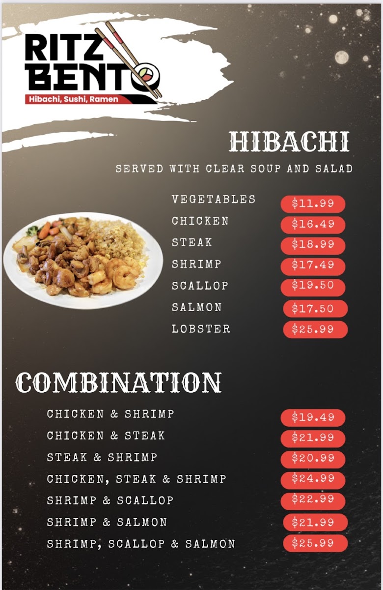 Ritz Bento also offers a variety of Hibachi options, from Hibachi Vegetables to Hibachi Shrimp, Hibachi Steak, and even Hibachi Scallops for those who enjoy their meal cooked on the grill.